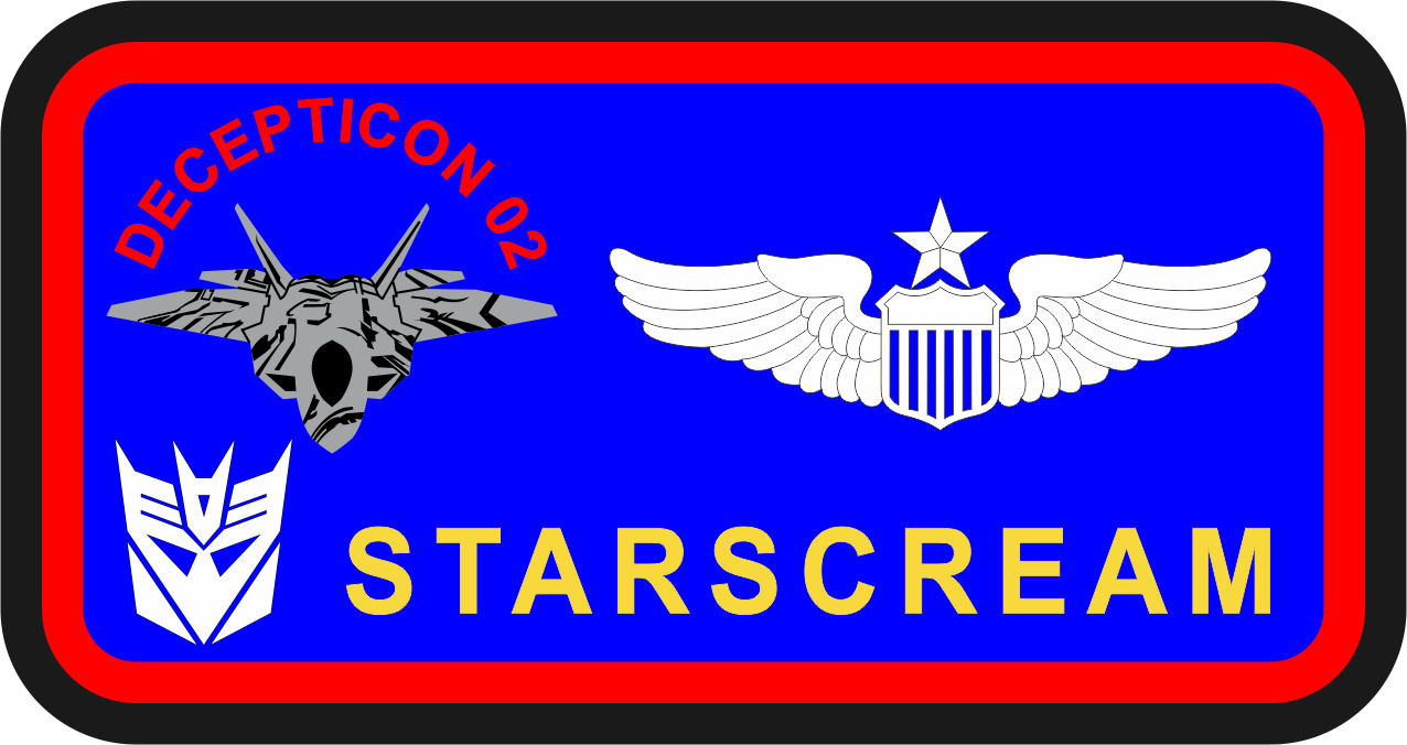 Decepticon "Starscream" Name Tag - AF Blue Background, Red Border, White Wings, Yellow Text, Gray/Black Aircraft, White Deception Logo