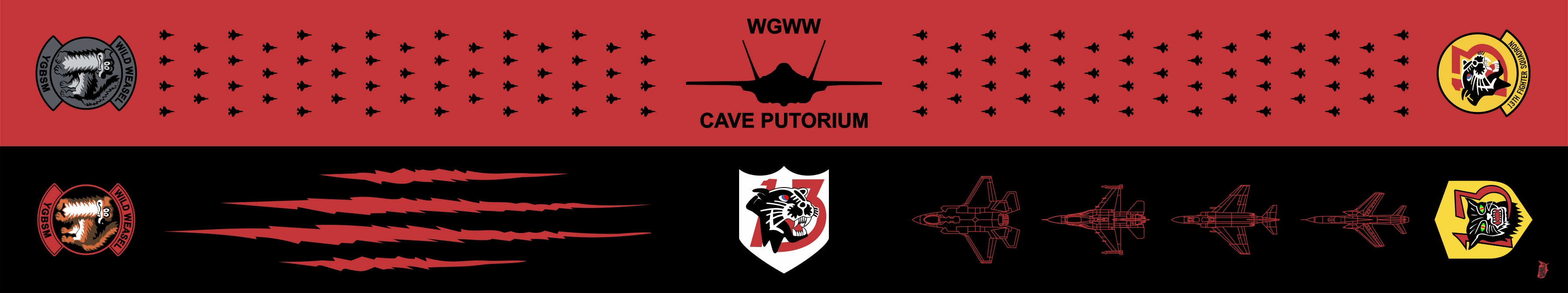 Misawa AB 13 FS Flight Scarf. Front Side: Red Background with SQ Patches on the Ends, F-35A Aircraft Silhouettes Throughout, and an F-35A Front View in the Center. Back Side: Black Background with SQ Patches on the Ends and Center of the Scarf, Claw Marks, and F-105, F-4, F-16, and F-35A Aircraft In Between the Patches. Size: 4" x 48".