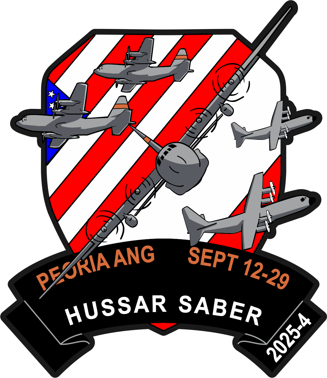 Peoria ANGB 169 AS Hussar Saber SEPT 12-29  2025-4, American Flag Background, Gray Aircraft, Black Banner Patch 4"