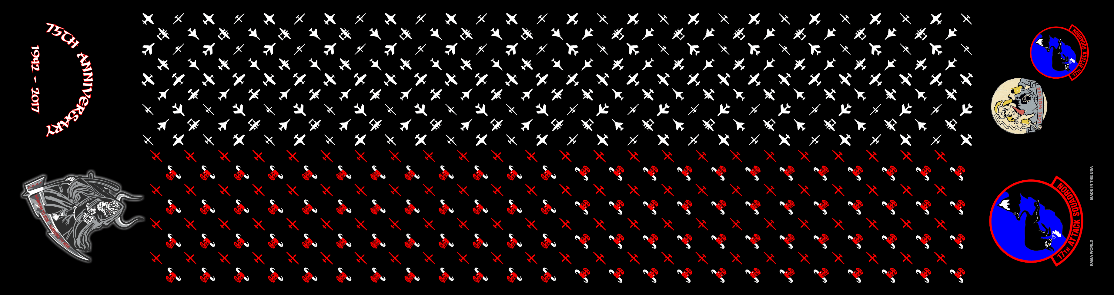 Creech 17 ATKS- Black body with red and white aircraft, bullheads over the whole scarf, on one end has 17 ATKS patches, on the other end 15th Aniversary 1942-2017 with a Bull dressed as the reaper holding a sickle in the sickle is reads "Nowhere to run nowhere to hide" Size 6" x 48"