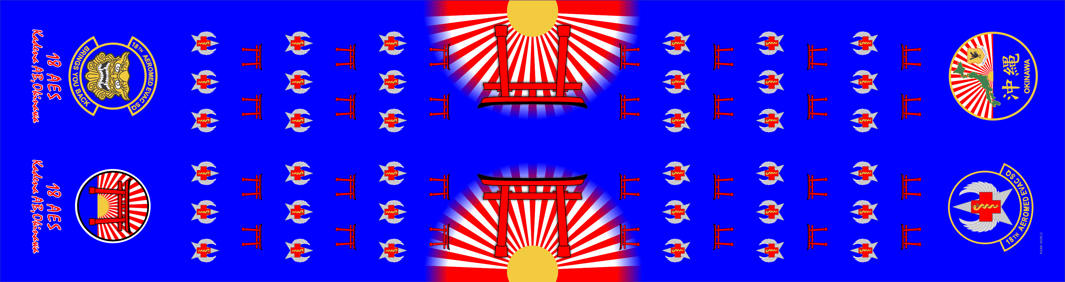 Kadena AB 18 AES- Blue body with Tori gate and logos alternating over the body, larger tori gate in the center "18 AES Kadena AB Okinawa" text under patches on one end. size 6" x 48"