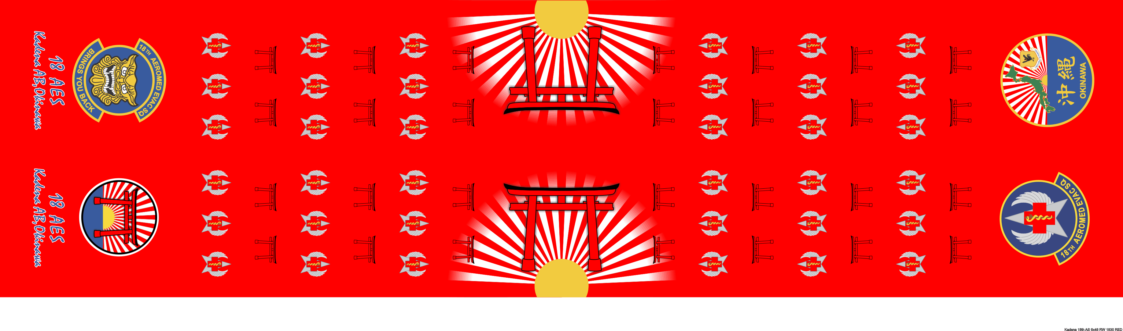 Kadena AB 18 AES- Red body with Tori gate and logo alternating over the body of the scarf, larger tori gate in the center of the scarf, "18 AES Kadena AB Okinawa" text under patches on one end. Size 6" x 48"