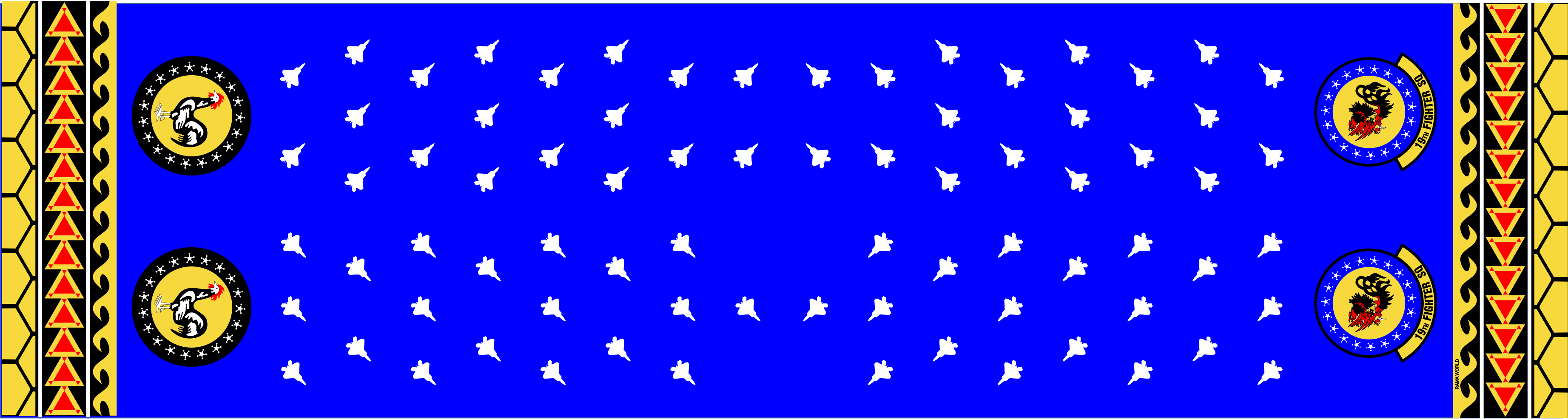 Hickam AFB 19 FS- Blue body with white F-22 over the body, both ends have tribal print and both ends have patches. Size 6" x 48"