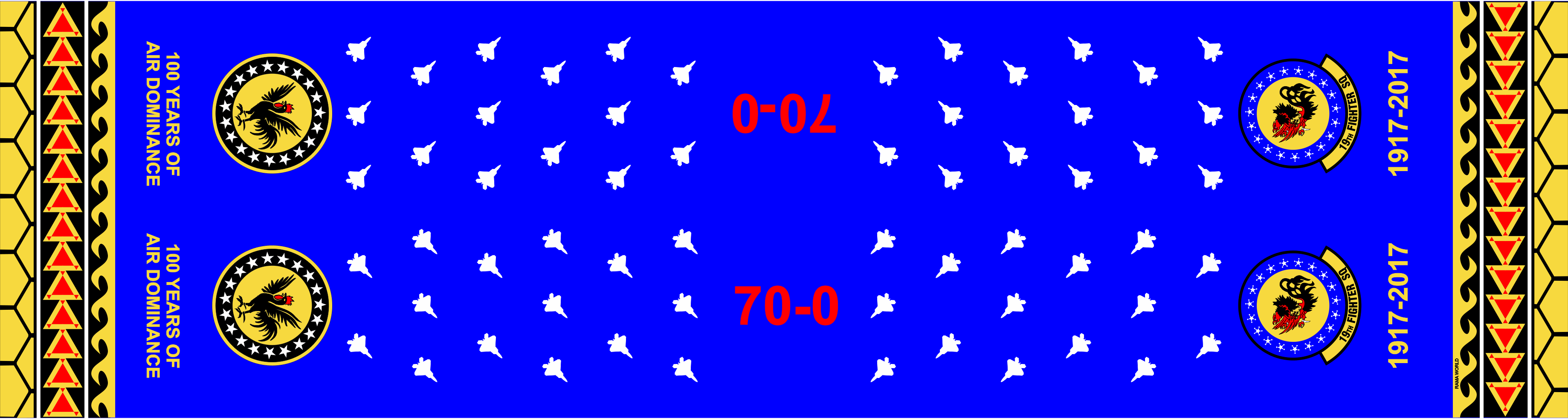 Hickam AFB 19 FS AF Blue Scarf with Tribal print on the sides, F-22 Pattern, "70-0" text in the center, Patches, and text on the ends. Size 6"x48".