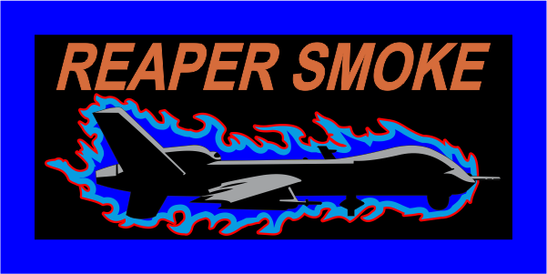 March ARB 196 ATKS Reaper Smoke Pocket Tab Black Background, Blue Border, MQ-9 Reaper with Flames. Pocket Tab 2"
