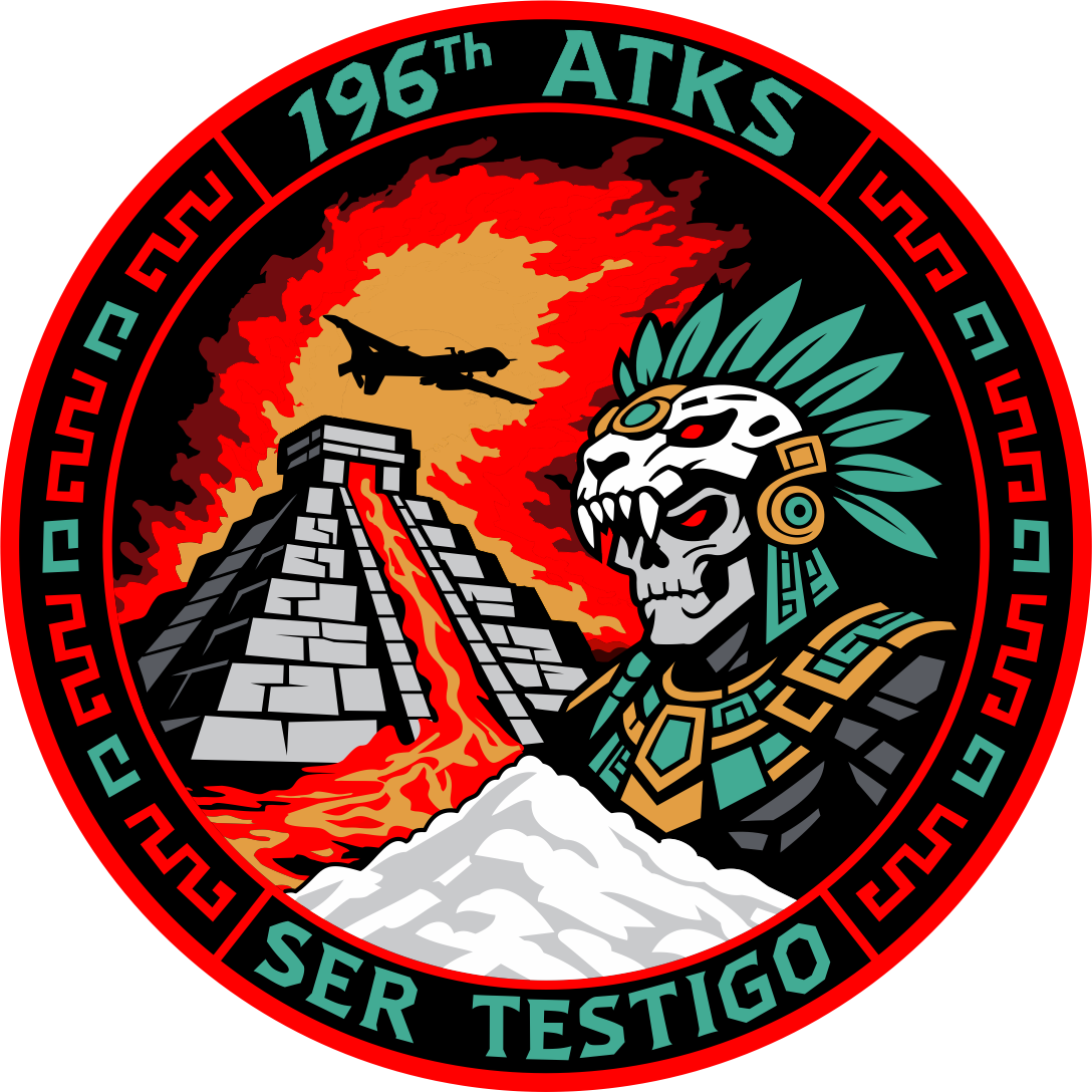 March ARB 196 ATKS Ser Testigo, MQ-9 Flying Over Explosion, Viking, Black Background, Red Border, Green Text, Full Color Patch 3.5"
