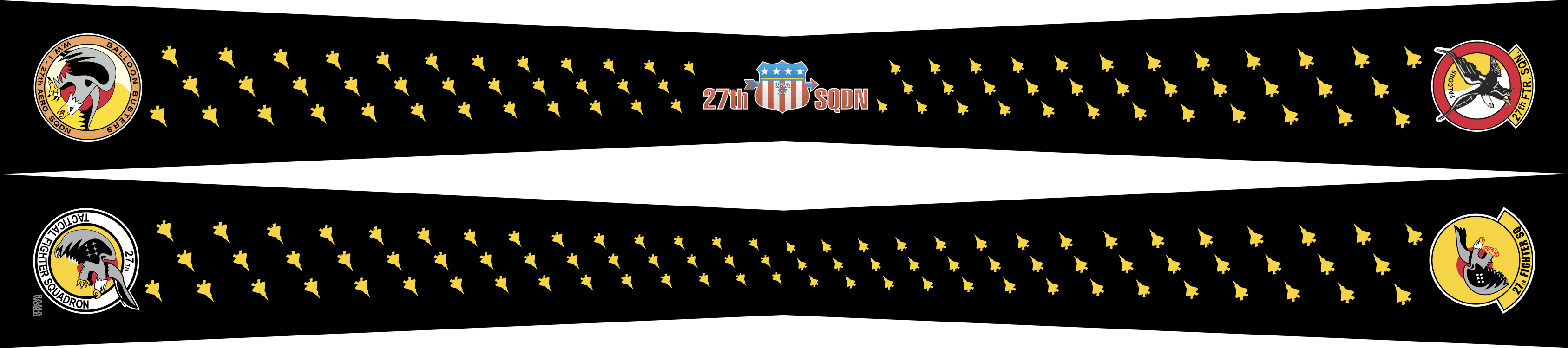 Langley AFB 27 FS- Black body with yellow F-22 over the body of the scarf, "27th SQDN" in the center of one side and patches on each ends. Size 4" x 2" 44"