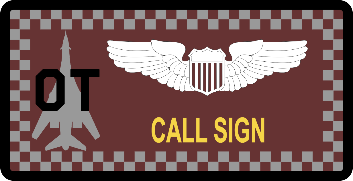 Dyess AFB 337 TES Friday Name Tag - Brick red and gray checkered background, black border, white wings and yellow text, a gray B-1b aircraft with OT on top. 100% embroidered tag. (center call sign under wings)
