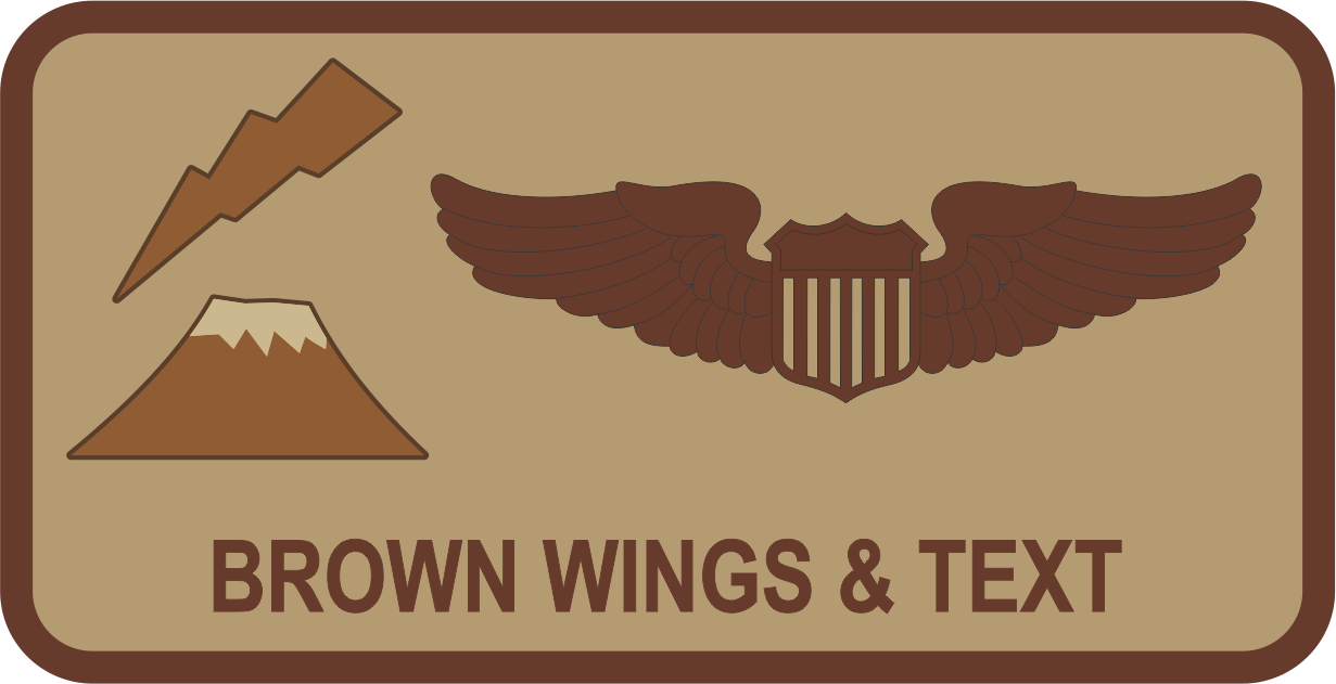 Yokota AFB 374 OSS Name Tag - Tan Background, Brown Border, Brown Wings and Text with Tan Lightning Bolt, Brown Volcano