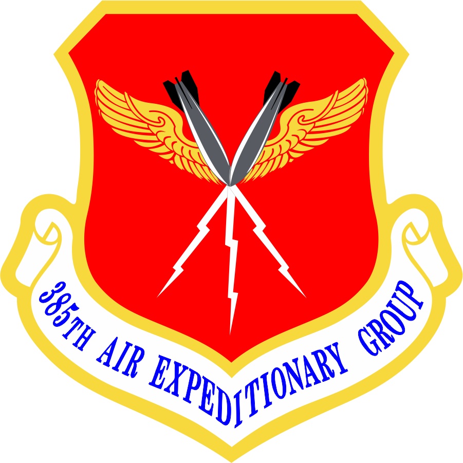 MacDill AFB 385TH Air Expeditionary Group, Red Background, Yellow Border, Yellow Wings, White Bolts, Gray Bombs, Blue Text, Full Color Patch 3"