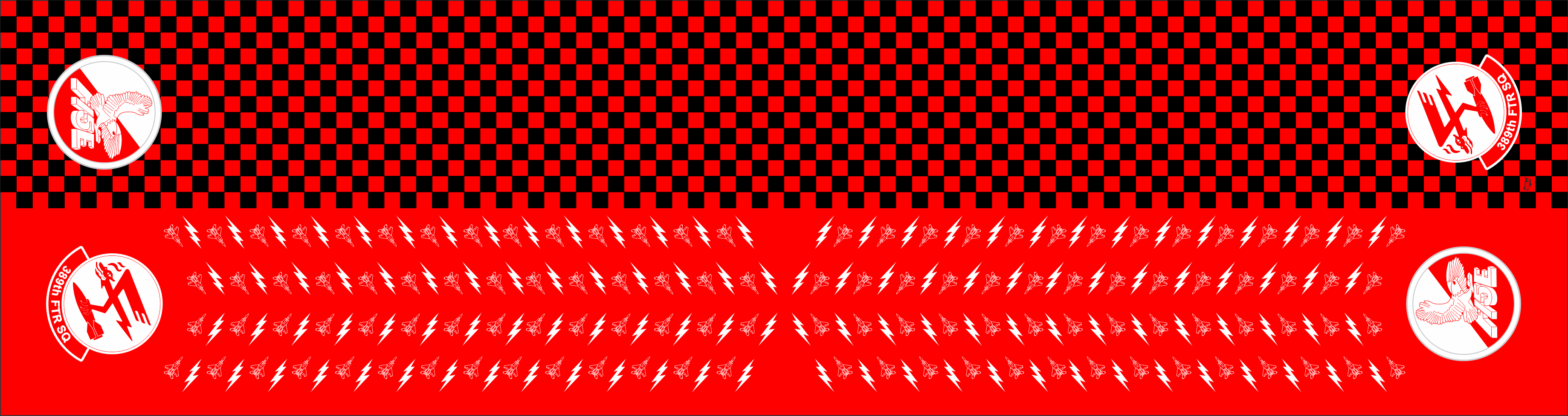 Mountain Home AFB 389 FS Flight Scarf. Front Side: Red & Black Checkered Patter, & Patches On The Ends. Back Side: F-15E & Lightning Pattern With Patches On The Ends. Size: 6" x 48".