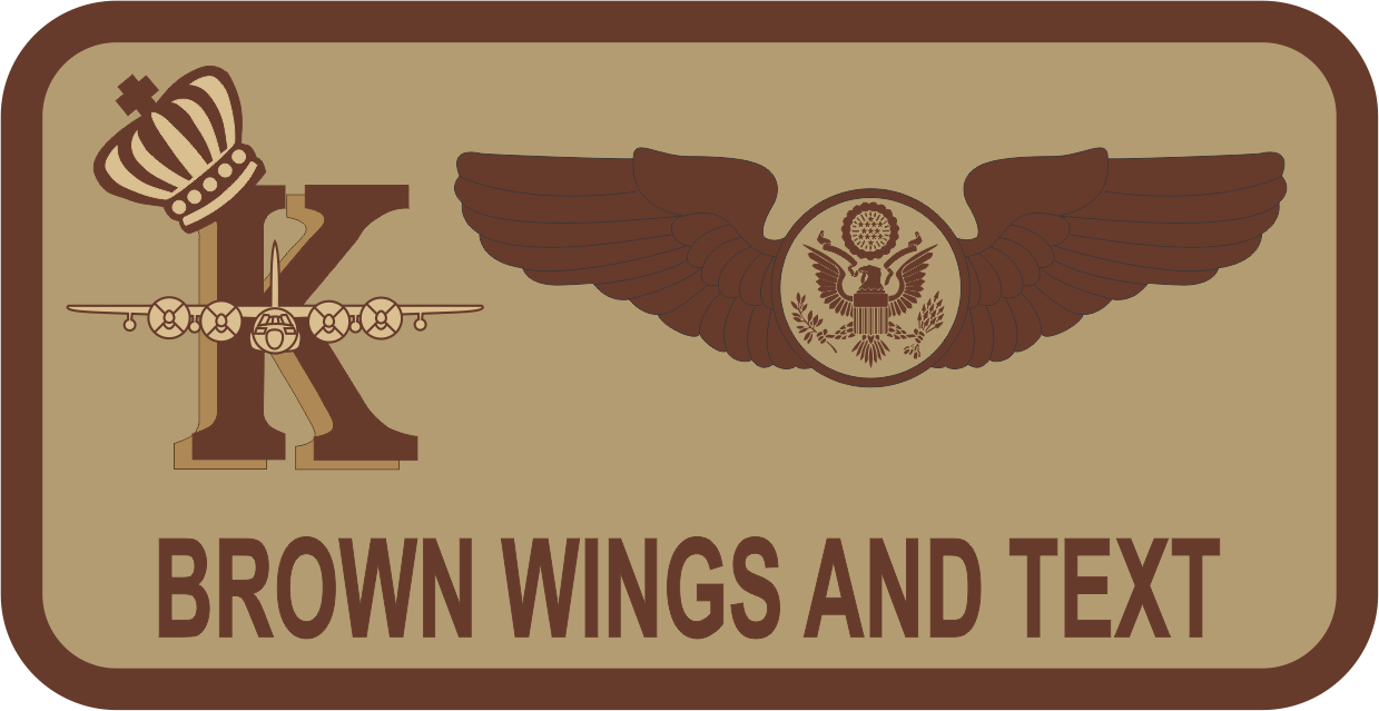 Patrick 39 RQS - Name Tag - Desert tan background with brown border, Large K with crown, and C-130 aircraft 100% embroidered