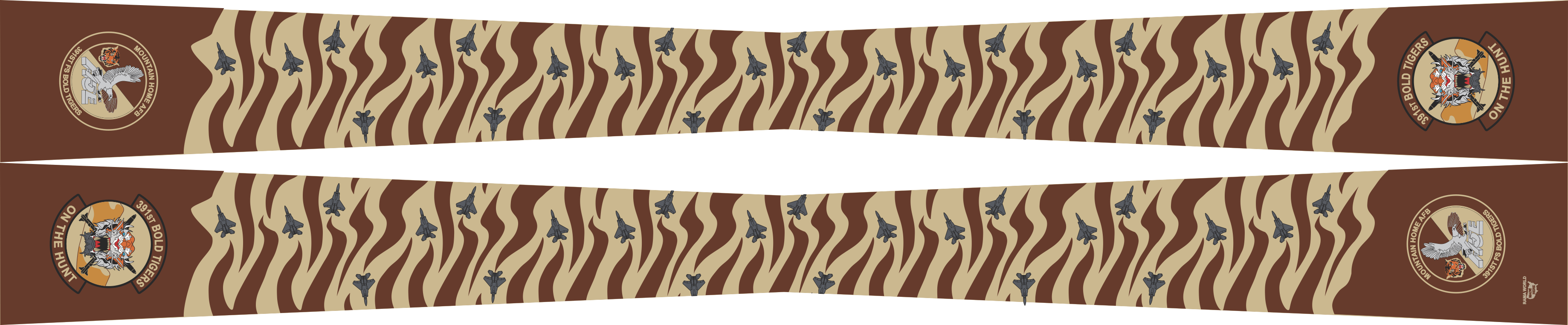 Mountain Home AFB 391 FS Desert Flight Scarf 2025. Spice Brown & Tan Tiger Stripes With F-15 Aircrafts &  Desert Colored SQ Patches On The Ends Of the Scarf. Size: 4" x 2" x 48".