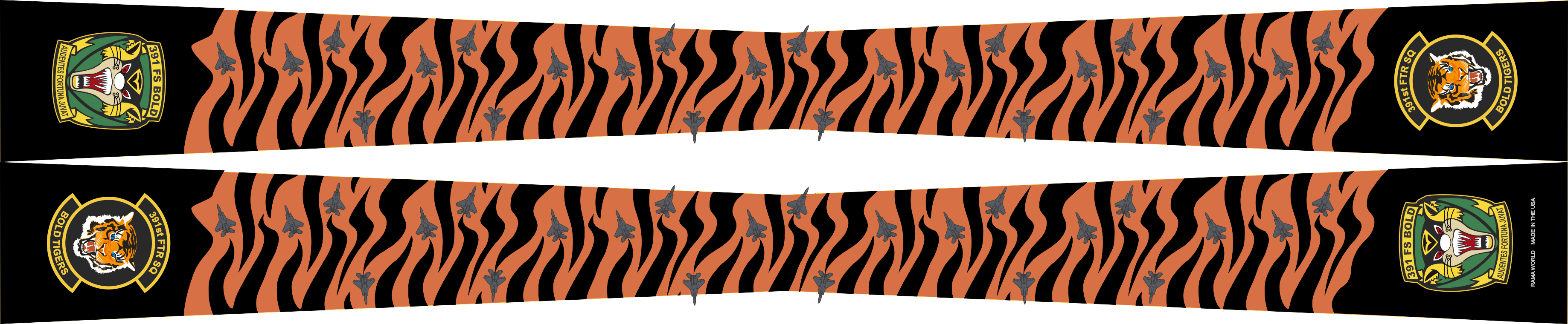 Mountain Home AFB 391st FS Flight Scarf - Black and orange tiger stripes, with gray F-15 aircraft's 4 patches at the ends. size: 4" x 2" x 48"