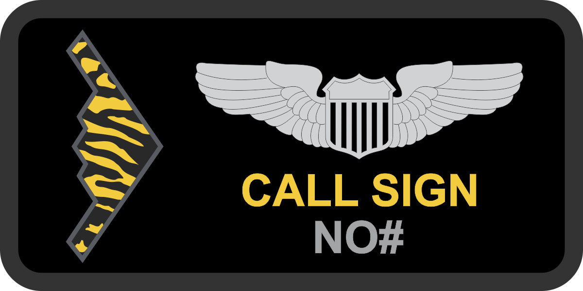 Whiteman AFB 393 BS- Black background, Black border, light gray wings, PF523 Yellow Name & PF483 Gray number with a tiger striped B-2 aircraft