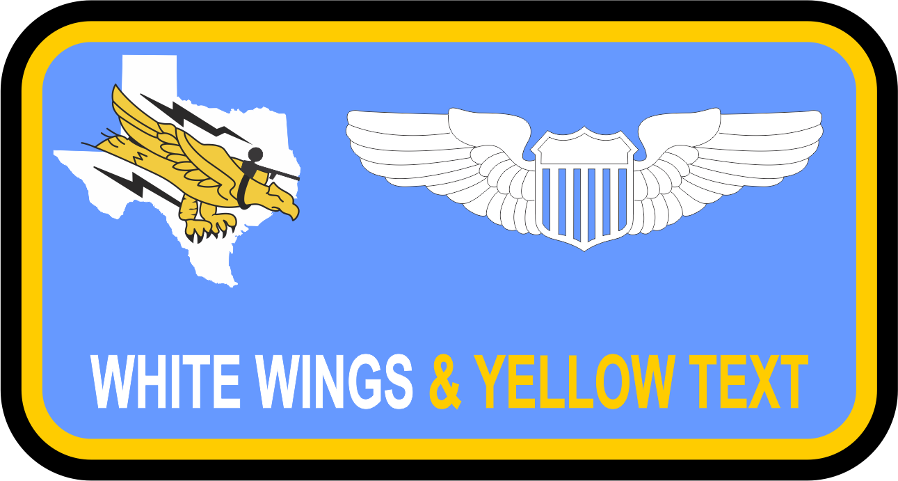 Dyess AFB 40 AS Heritage Name Tag- Light blue background with yellow border, logo with Texas state outline, white wings with yellow text, with leather backing. 100% Embroidered