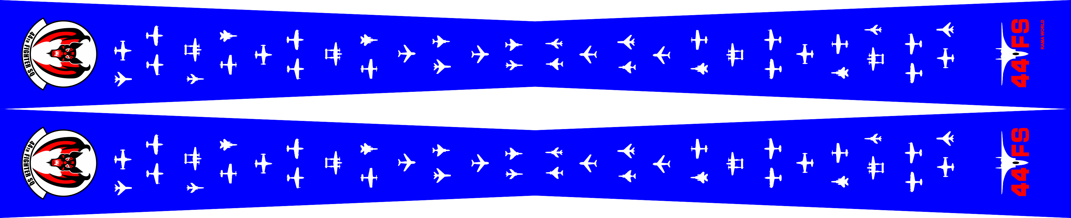 Kadena AB 44 FS Flight Scarf - Blue body with white aircrafts alternating over the scarf 44 FS patches at one end and "44 FS" written on the other end. Size 4" x 2" x 48"