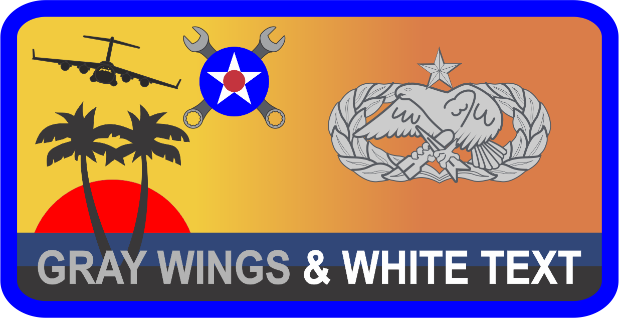 March ARB 452 AMXS Name Tag - Orange, yellow with sunset, palm tree, C-130, and maintenance logo Gray wings and white text
