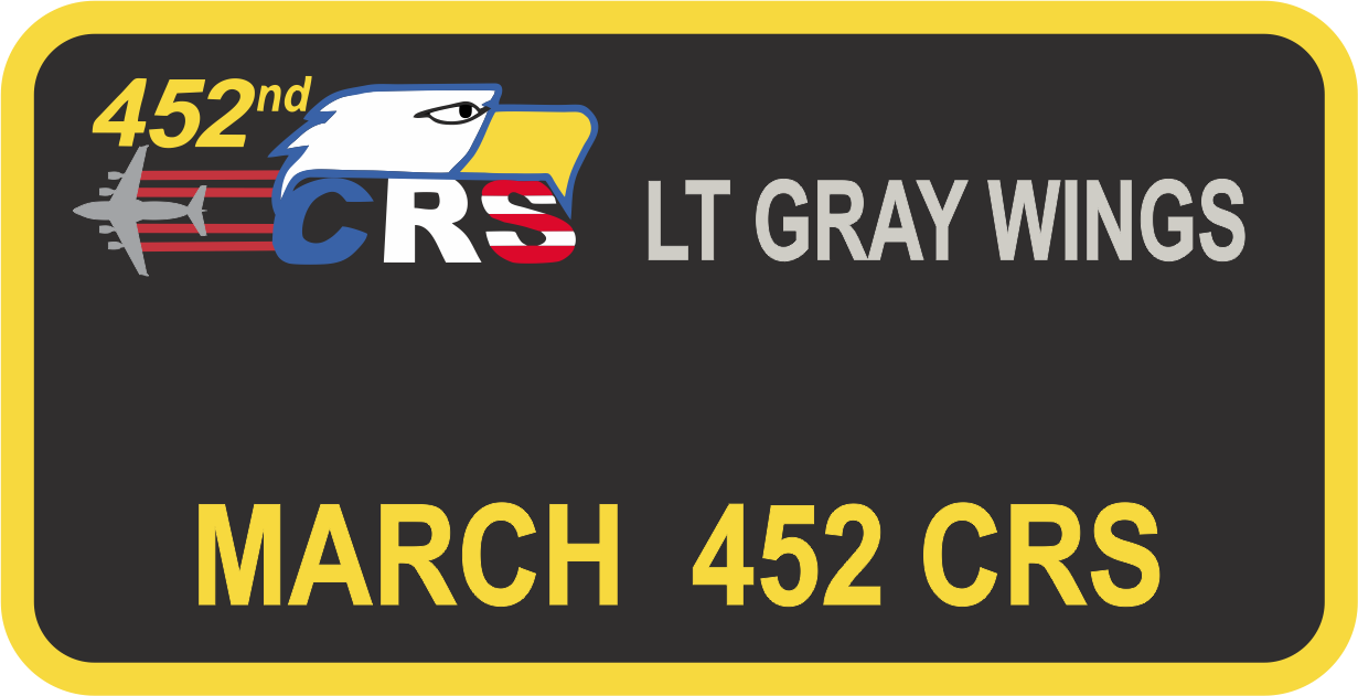 March ARB 452 CRS Name Tag - Black background, light gray wings, AF yellow text with an Eagle, C-17 452 CRS logo