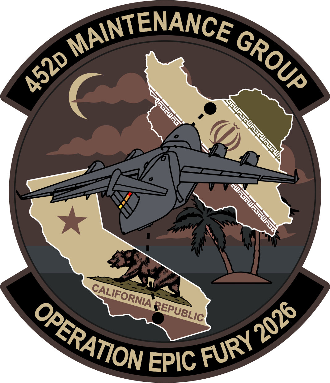 March ARB 452D Maintenance Group Operation Epic Fury 2026, California State Outline, Iran Outline, Gray C-17, Patch PVC 4"