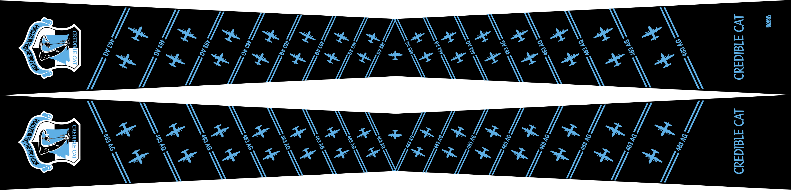 Little Rock AFB 463 AG Flight Scarf - Black body with 463 AG and C-130 alternating over the body of the scarf, patches at one end and "Credible cat" at the other end. Size 4" x 2" x 48"