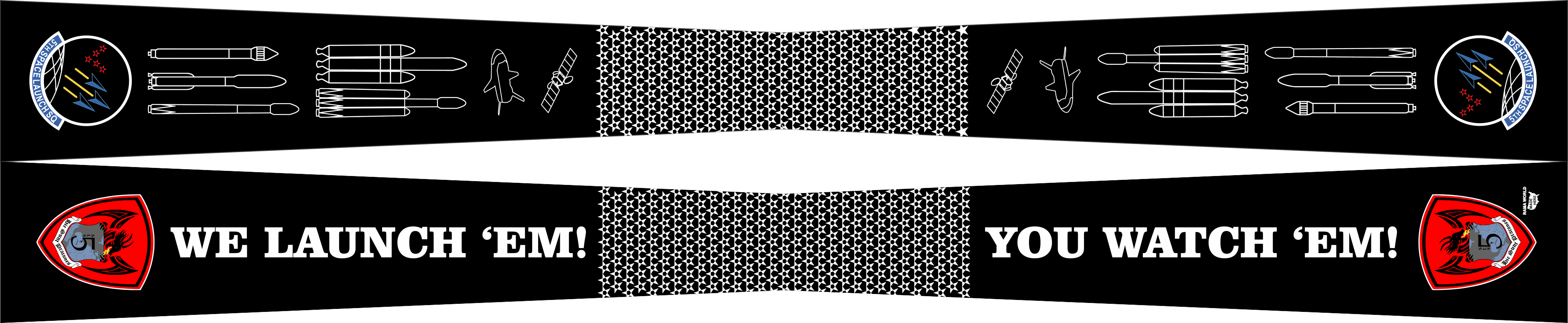 Patrick AFB5 SLS Flight Scarf - One half is black with white missiles outlined star's in the center and patches on the ends, other half is also black "We launch 'Em!" star's in the center, You watch 'Em" text with patches on the ends. Size 4" x 2" x 48"
