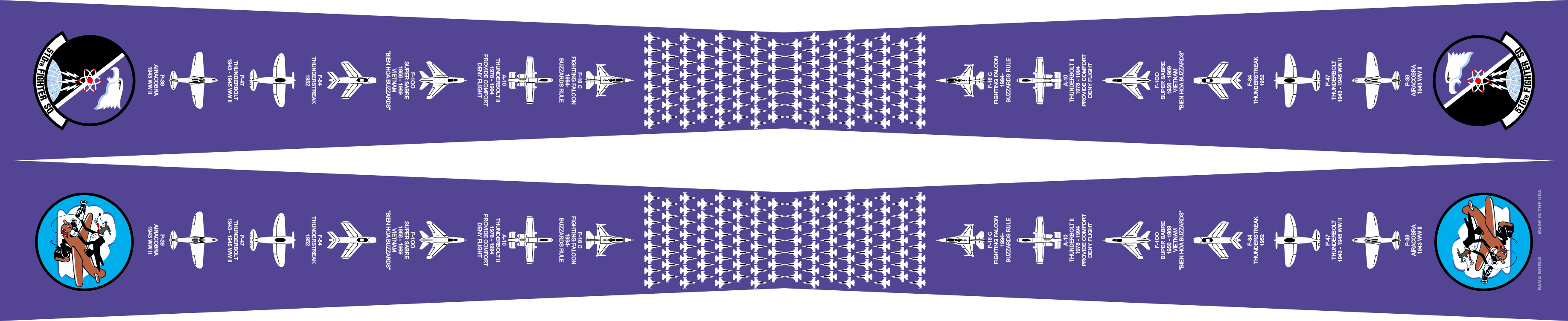 Aviano AB 510th Fighter Squadron Historical Scarf - Purple background with white P-39, P-47, F-84, F-100, A-10, F-16C with dates flown, the center of neck area F-16C current aircraft, heritage patch on two ends, squadron patch on opposite ends. Size 4" x 2" x 48"