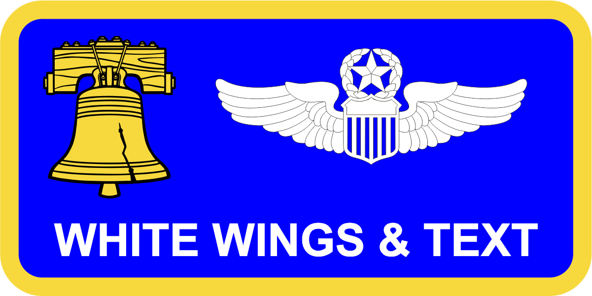 Dover 512 OSS Regular Name Tag- Royal Blue Background, Yellow Border, White Wings & Text, Yellow Liberty Bell with Black Cracks - Leather Backing Optional