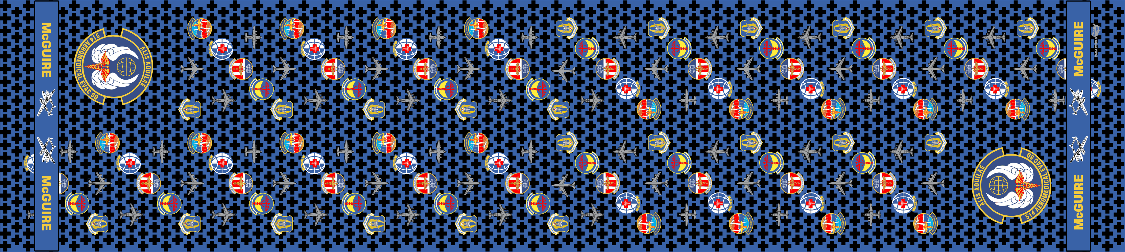 McGuire AFB 514 AES Flight Scarf - Blue body with black crosses over the body of the scarf, five different patches and aircrafts Alternating over the black crosses of the scarf, 2 larger patches on the opposite ends and "McGuire" on the ends. size 5"x48"