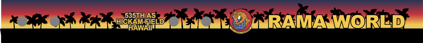 Hickam AFB Bag Tag with a Sunset color background, black base, Palm Tree silhouettes along the Bag Tag, "535TH AS Hickam Field Hawaii" text inbetween snaps and 535 AS "Tiger" Patch on the left side of call sign. Our standard size measures 13.5" x 1.5" when snapped.
