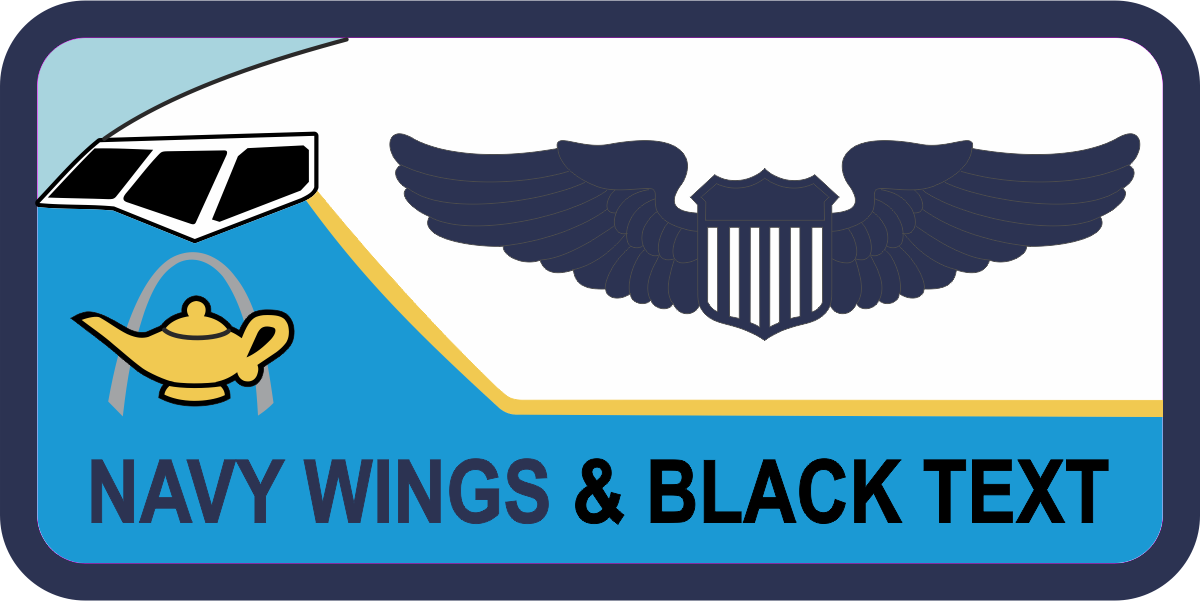 Scott AFB 54 AS Jet Name Tag- Blue/White Background with Navy Border, Navy Wings & Black Text with Jet in the Background. Optional Leather Backing