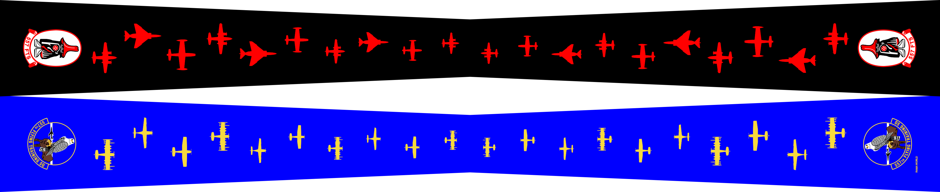 USAF Academy 557 FTS Flight Scarf. Front Side: Black Background With Red Aircraft Pattern and SQ Patches on the Ends. Back Side: AF Blue Background With AF Yellow Aircraft Pattern and SQ Patches on the Ends. Size: 4" x 2" x 4" x 48".
