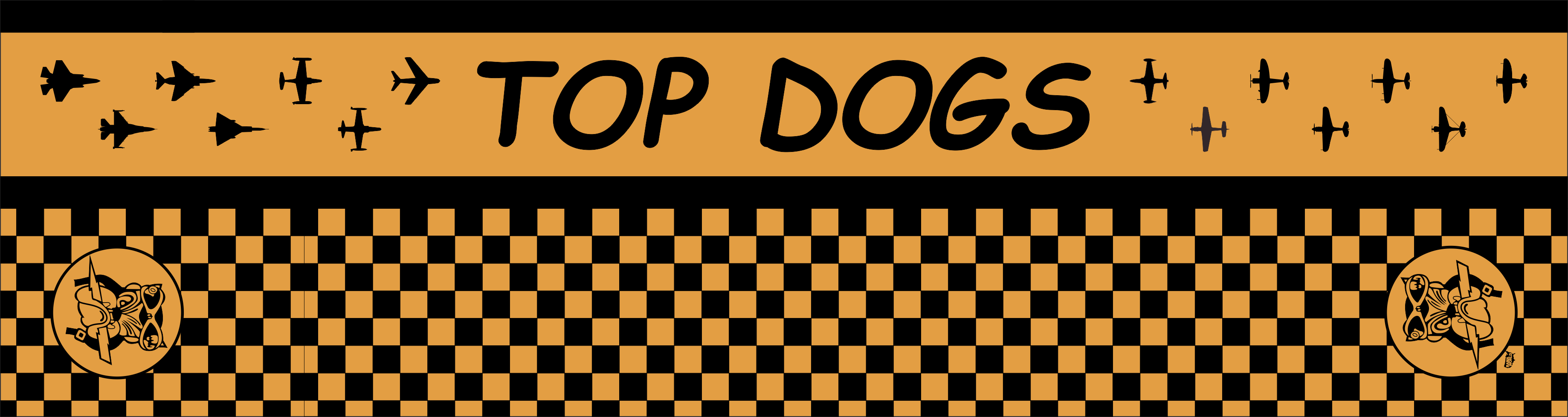 Luke AFB 61 FS Flight Scarf. Front Side: Gold Strip With Black Edges, F-35, F-16, F-4, F-10, F-89, F-94, F-86, F-80, P-51, P-47, P-40, P-39, P-36, P-35, and "Top Dogs" Text. Back Side: Gold and Black Checker Pattern With SQ Patch on the Ends. Size: 6" x 48".