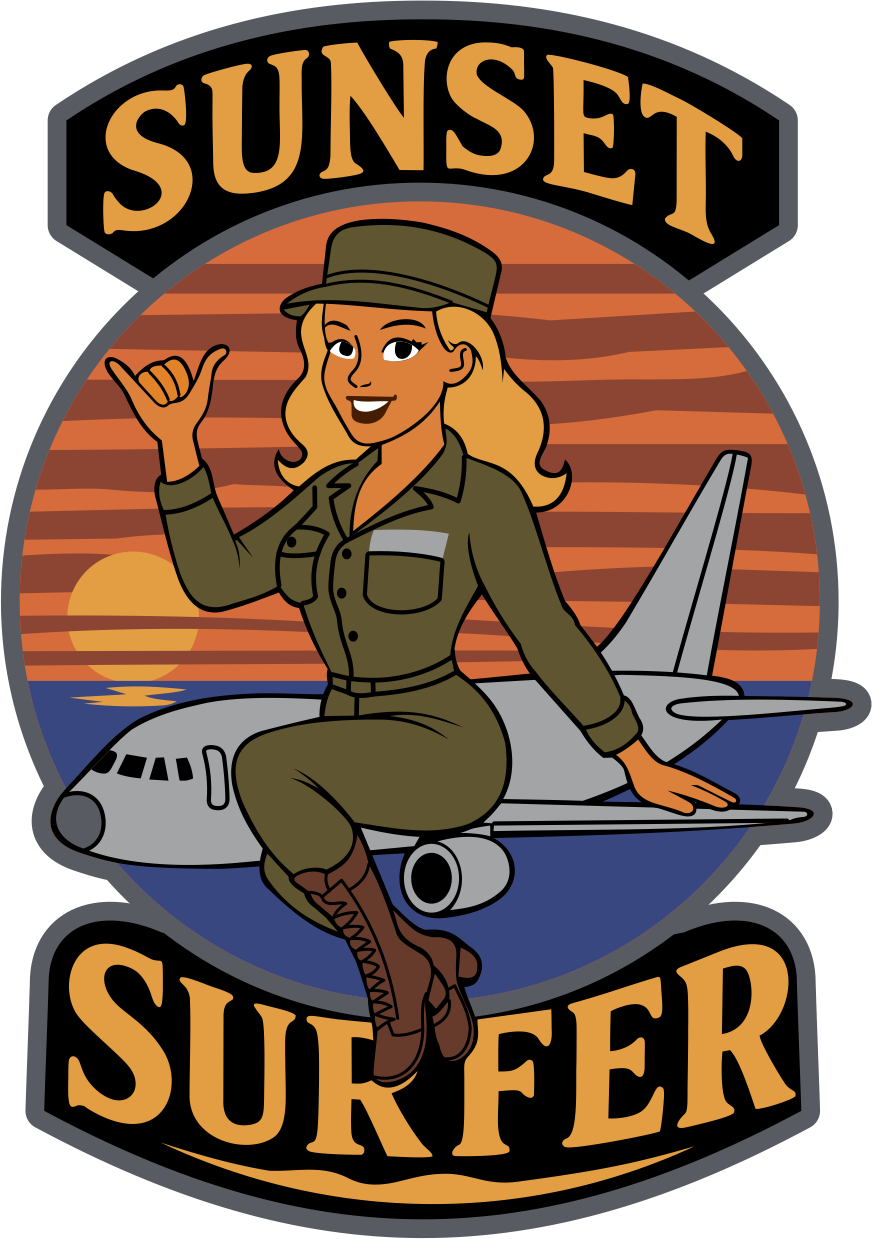 Travis AFB 660 AMXS Sunset Background, Gray Border, Lady in Flightsuit Sitting on Gray Aircraft, Sunset Surfer, Patch 4"