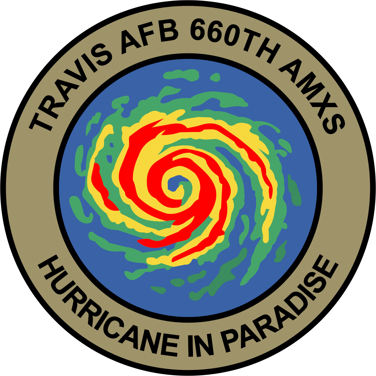 Travis AFB 660 AMXS Blue Background, Black Border, Hurricane In Paradise, Patch 4"