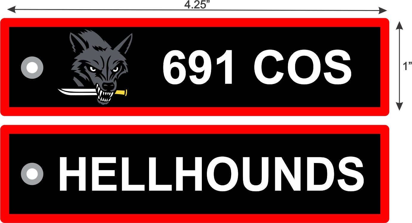 Ramstein AB 691 COS Hellhounds, Black Background, Red Border, Gray Wolf with White/Yellow Sword, White Text, Key Chain