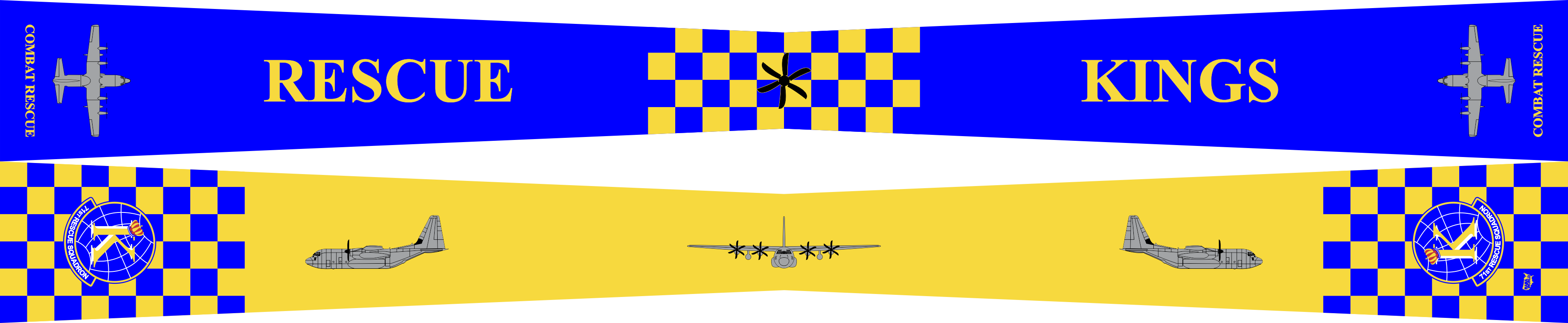 Moody AFB 71 RQS Flight Scarf. Front Side: AF Blue Background With HC-130J Aircrafts on the Ends, "Rescue Kings" Text, Yellow and Blue Checkered Pattern and 6-Blade Propeller In the Center. Back Side: AF Yellow Background With HC-130J Aircrafts Through the Center of the Scarf, Checkered Pattern and SQ Patches on the Ends. Size: 4" x 2" x 4" x 48".
