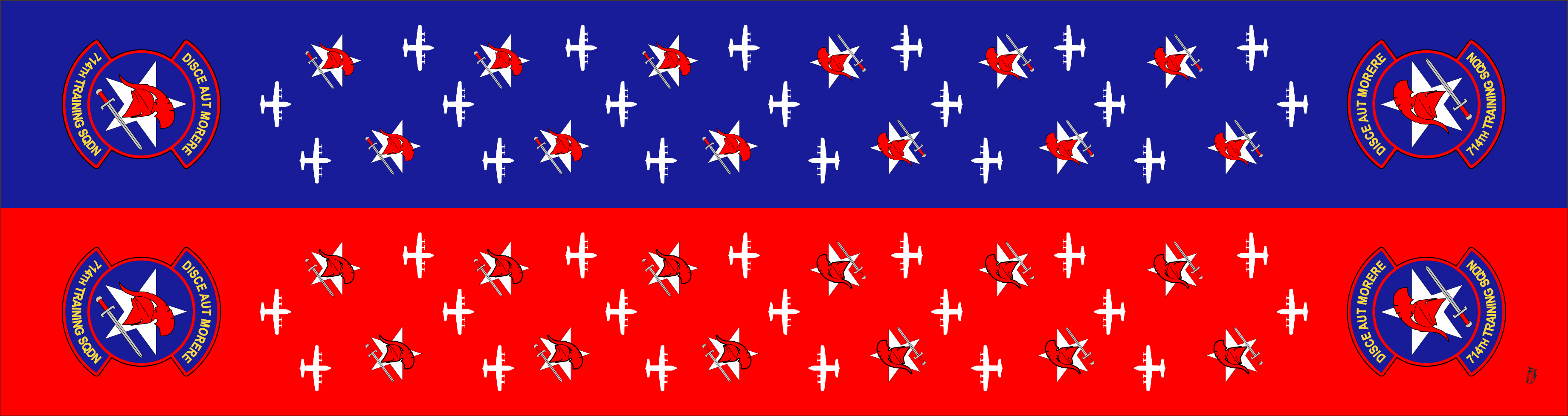 Little Rock AFB 714 TRS Flight Scarf. Front Side: AF Blue Background With SQ Emblem on the Ends and C-130 Aircrafts and SQ Emblem Through the Center of the Scarf. Back Side: Red Background With SQ Emblem on the Ends and C-130 Aircrafts and SQ Emblem Through the Center of the Scarf. Size: 6" x 48".
