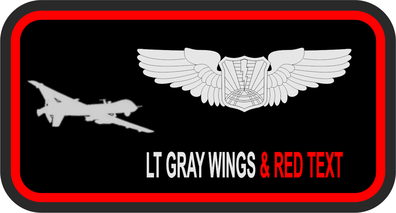 Creech 732 OG Name Tag: Black background, Red border, Lt Gray wings, Red text, and leather backing. Includes a gray side view MQ-9 on the left center side.