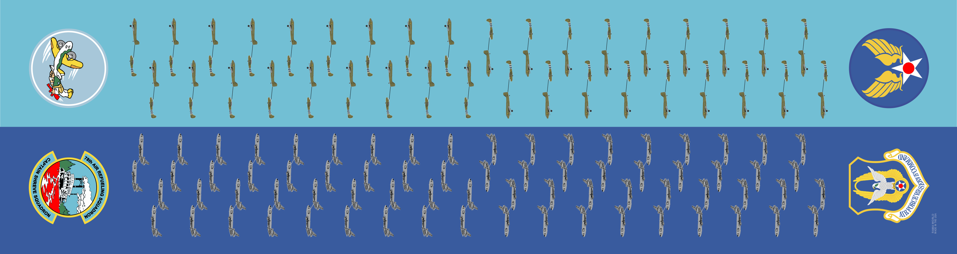 McGuire AFB 78 ARS Flight Scarf - Half Blue and light blue body with gray C-47 towing a glider over the body of the scarf and patches and logos on each end. size 6"x48"