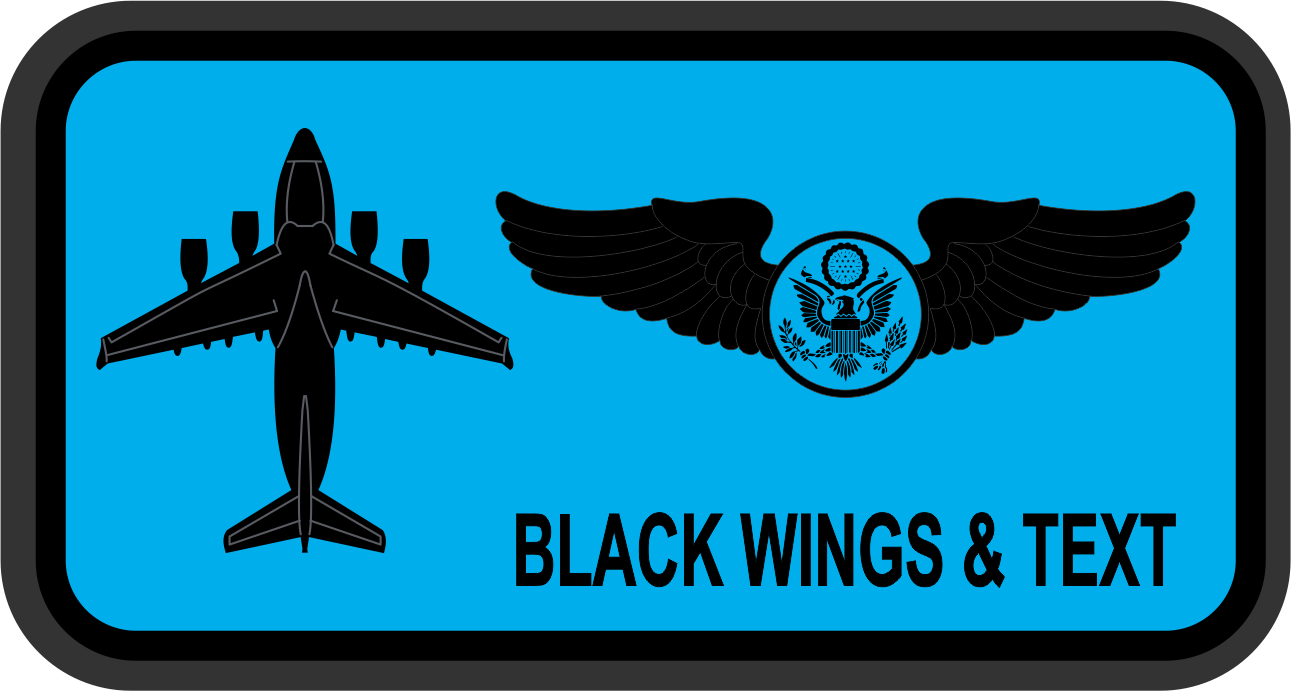 McChord AFB 8 AS Friday Name Tag - Blue Background with Black Border, with Black C-17 Top View, Leather Backing, Black Wings & Text