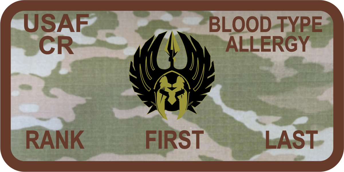 Travis AFB 821 CRSS Name Tag - OCP Background, Brown Border, Black & Bagby Gladiator, Brown Text. Optional Leather Backing