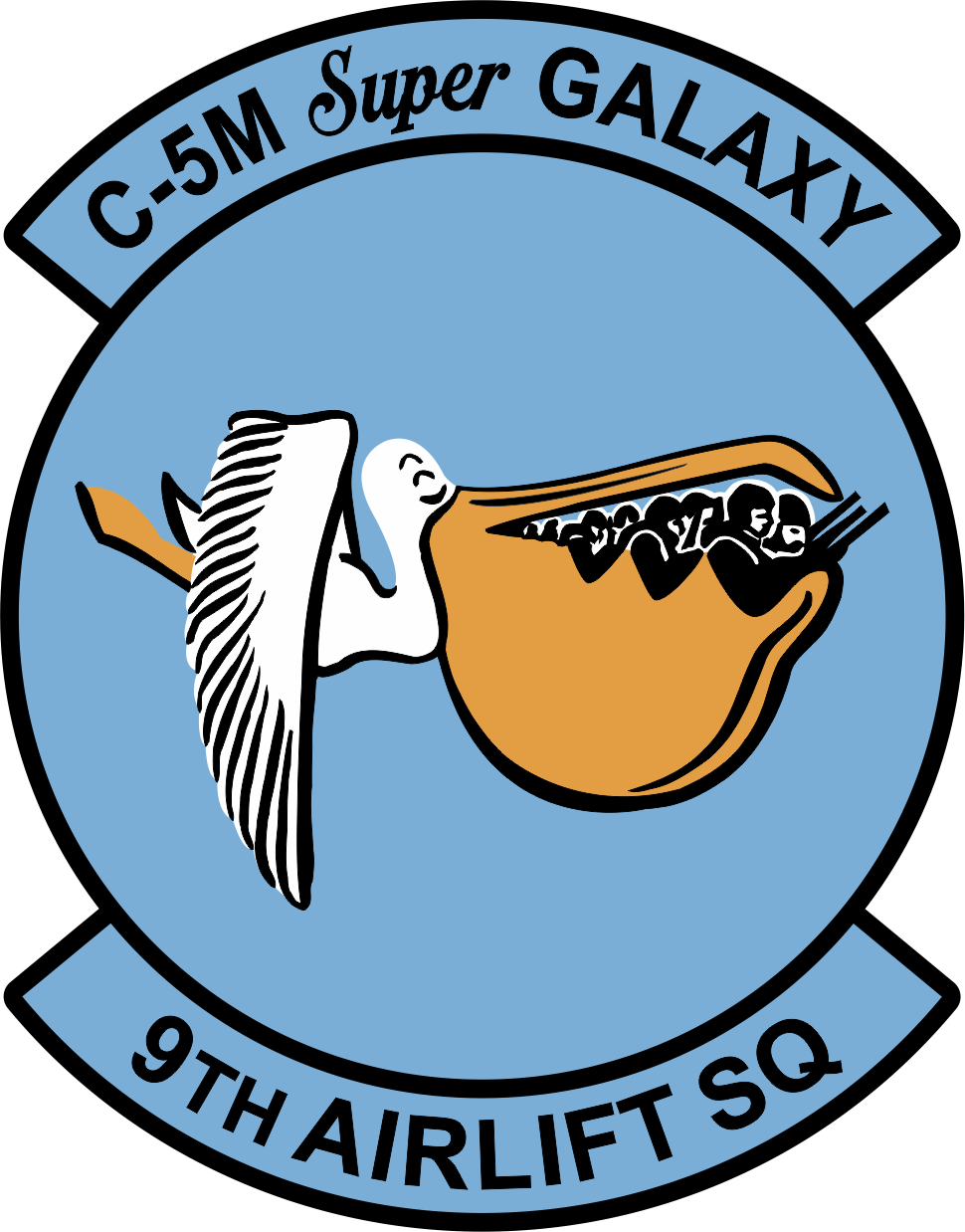 Dover AFB 9TH Airlift Sq C-5M Super Galaxy Lt Blue Background, Black Border, Golden-Orange & White Pelican with Troops, Patch 4"