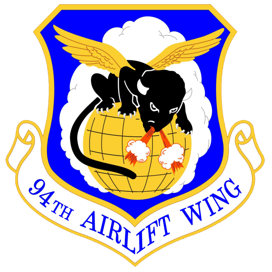 Dobbins ARB 94th Airlift Wing - Black Snorting Bull with Wings on Top of Globe, White Cloud Behind Bull, 94th Airlift Wing Text 3" with velcro