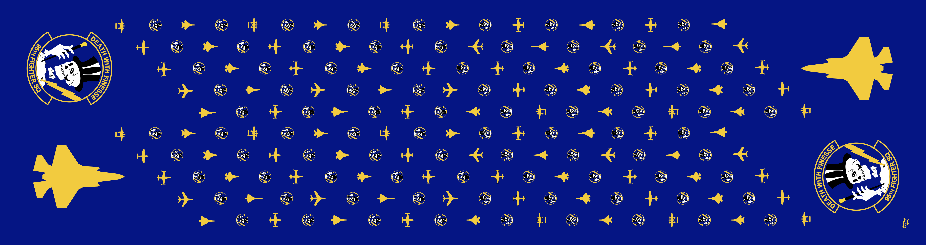 Tyndall AFB 95 FS Flight Scarf. AF Blue Background With Squadron Patches and an F-35A Aircraft on Both Ends of the Scarf. Throughout the Scarf Include the Following Aircraft: P-38, F-51, F-94B, F-86D, F-102, F-106, T-33, F-15C/D Eagle, F-22A, and F-35A, Along With the "Mr. Bones" Emblem.