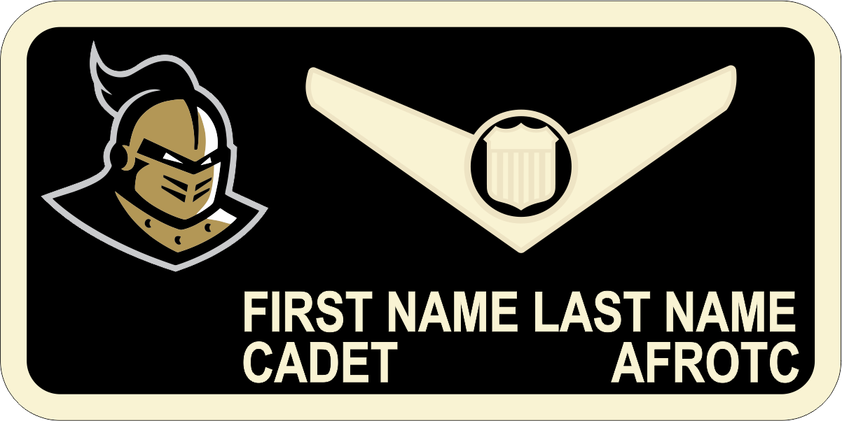 University of Central Florida AFROTC Det 159 Name Tag Black Background, Ivory Border, Ivory Wings & Text, with Black & Gold Knight Head Logo on the left