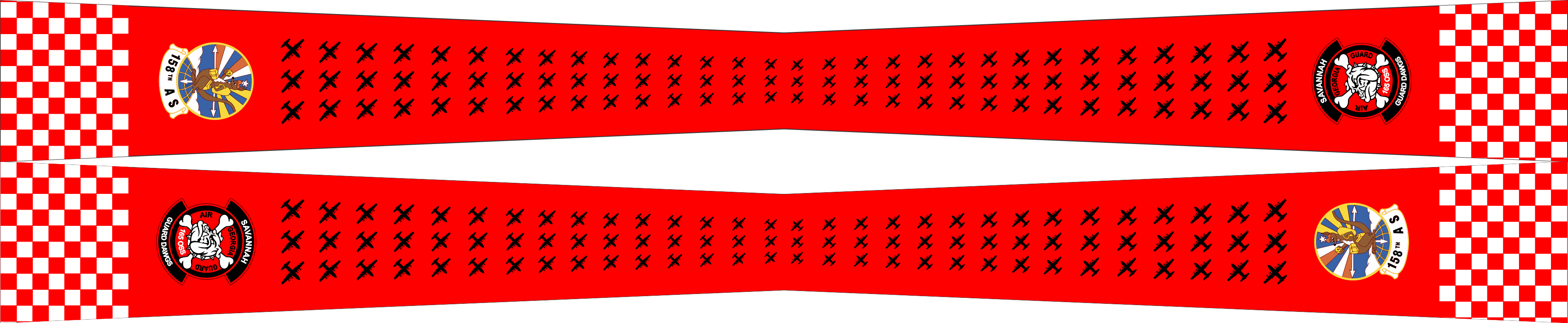 Savannah ANG 158 AS Red Flight Scarf with Red and White Checker Pattern and SQ Patches On The Ends. C-130 Pattern along the Flight Scarf. Size: 4" x 2" x 4" x 48".