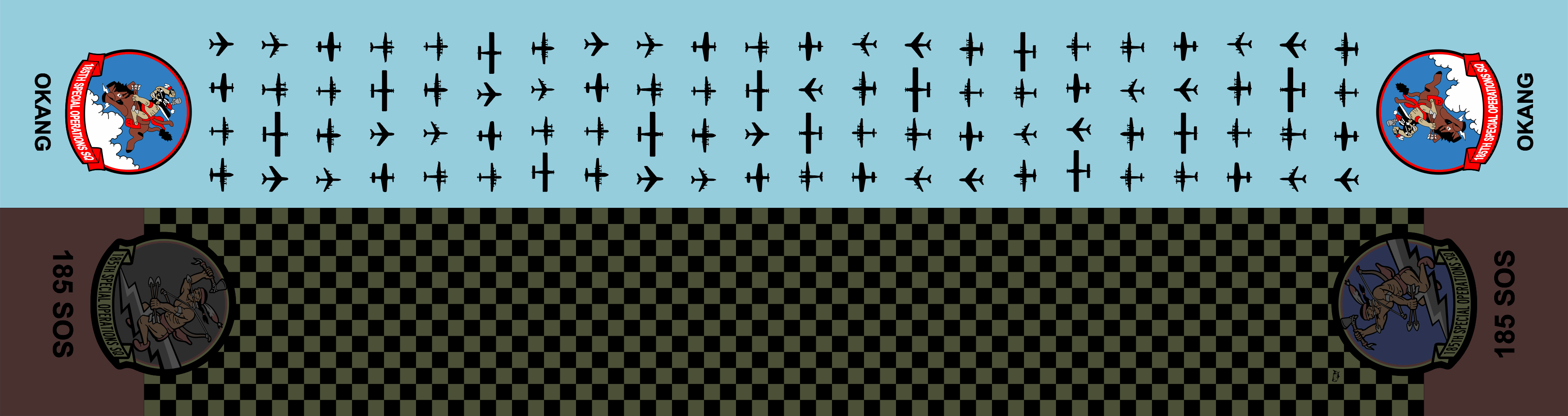 Will Rogers ANG 185 SOS Flight Scarf. Front Side: Sky Blue Background With Multiple Aircrafts & Heritage Patch On The Ends. Back Side: Green & Black Checkerboard Pattern, Subdued SQ Patch On The Ends. Size: 6" x 48".