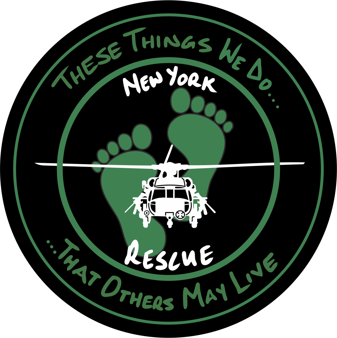 New York ANG 101 RQS Friday Patch - Black Background, Green Feet & Text, These Things We Do... ...That Others May Live, White HH-60G Pave Hawk Helicopter, White Text - New York Rescue 3.5" with velcro