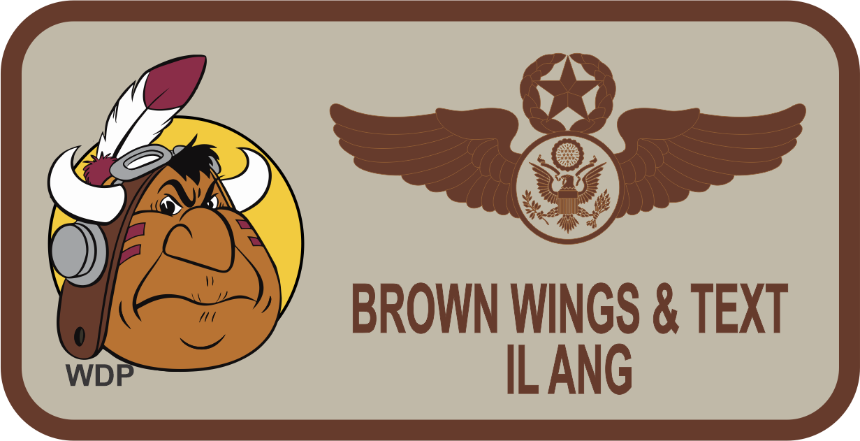 Illinois ANG 169 AS - Desert Name Tag- Tan Background, Brown Border, Indian Head Logo, Brown Wings & Text with Leather Backing - The customer wants RAMA Wings NOT Mardon Wings